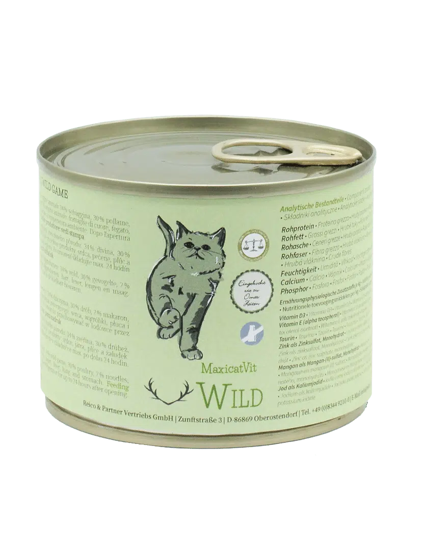 MaxicatVit Wild ist ein Alleinfuttermittel mit ausschließlich hochwertigen Zutaten, das in Deutschland hergestellt und schonend kalt abgefüllt wird. Es enthält keine Aroma- und Konservierungsstoffe und keinen Zuckerzusatz. Probieren Sie auch unsere anderen Sorten für mehr Abwechslung. Fütterungsempfehlung: Eine Dose (200g) deckt den Tagesbedarf einer Katze bis 3 kg Gewicht. Bitte füttern Sie immer zimmerwarm und passen die Futtermenge an Rasse, Alter und Aktivität an.